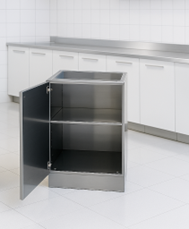 This stable, free-standing base cabinet is made from ground stainless steel (Material No. 1.4301 – AISI 304) and meets DIN 18860 standards. It includes:
