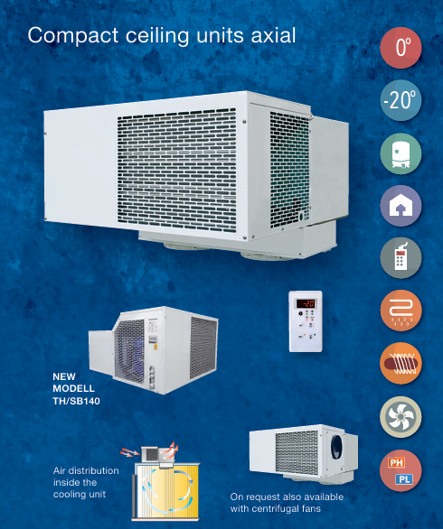 The models of the sb series are compact units, which convince through their versatility. they’ll be mounted on the ceiling of the cold room, therefore the inner space of cell will be totally untouched. the casing of the unit and the evaporator is made out of lacquered sheet with an epoxy-coating. the evaporator is built in a separate box, which is connected thermally to the cooling unit. the compressors are hermetic compressors and function with the refrigerant r404a or r134a.